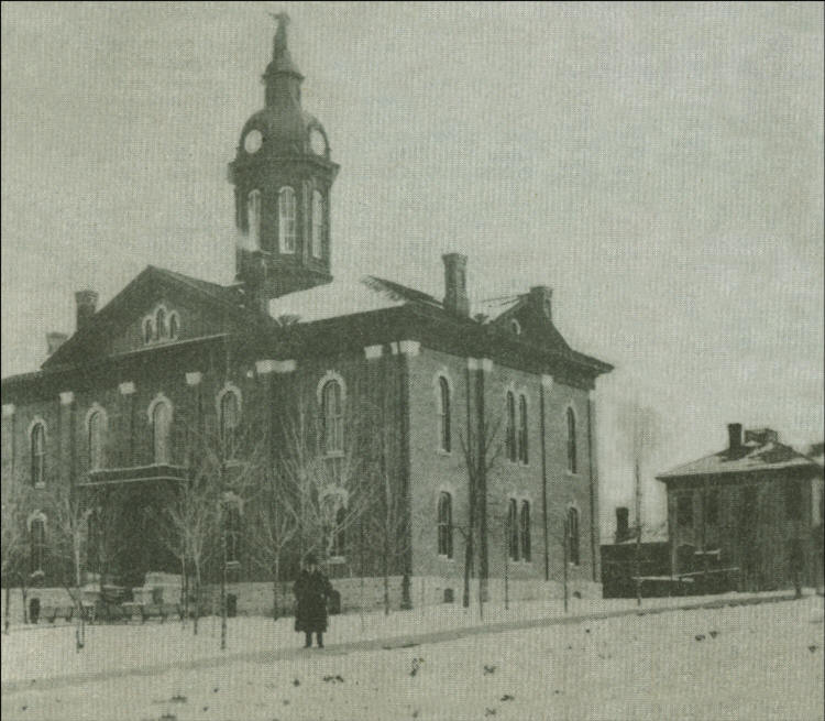 The original courthouse, which was used until the 1876 structure was built, was on the south side of Fifth Street, between Hewett and Court, where it was used as an express office and dwelling. It was later moved a short distance down the street and then remodeled and veneered with brick. The old building was a frame structure 40 x 50 feet, two stories high. Six small offices were on the first floor. At the north and south ends, two inside stairways led to the upper floor, where the court room and jury room were located.