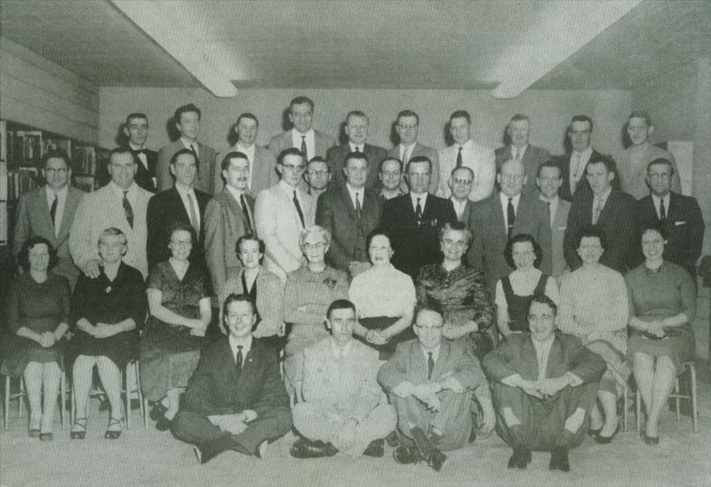 The Classes started September 29, 1959: Left to right, front row: Instructor, Les Sjobeck Amery, Wis., Graduate Assistants: Bill Krause, Withee, Ed Lehnen, Owen, and Art Drescher Neillsville. 2nd row: Lorretta Smith, Irene Vanderwyst, Doris Antrim, Irma Stucki, Clara Henchen, Hazel Hubing, Ruby Meihack, Margie Garbisch, Judy Berget and Rogene Gruenke. 3rd row: Vern Smith, LaVerne Vanderwyst, Rev. Eugene Antrim, Wayne Grap, Marvin Garbisch, Smith, Milford Tesmer, Dick Van Gorden, August Stremikis, Bill Meier, Lowell Schoengarth, Gene Ross, Lester Goke and Ray Paulson. 4th row: Alex Poziombke, Chuck Marvin, Jim Hannon, Frank Svetlik, Don Schiesel, Ervin Kroll, Russ Schmidt, Ernest Kuhn, Bob Reisner and Don Marg. (Photo courtesy of Bill Lowe)