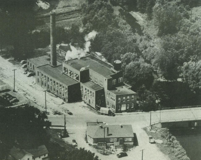 Neillsville Condensed Milk Products building was located along O’Neill Creek, now site of the Fire Hall. The aerial view, circa 1940, included the American Legion Hall and parking lot, as well as the partially visible James O’Neill house. Hewett and Eighth Streets joined by the Condensary. |