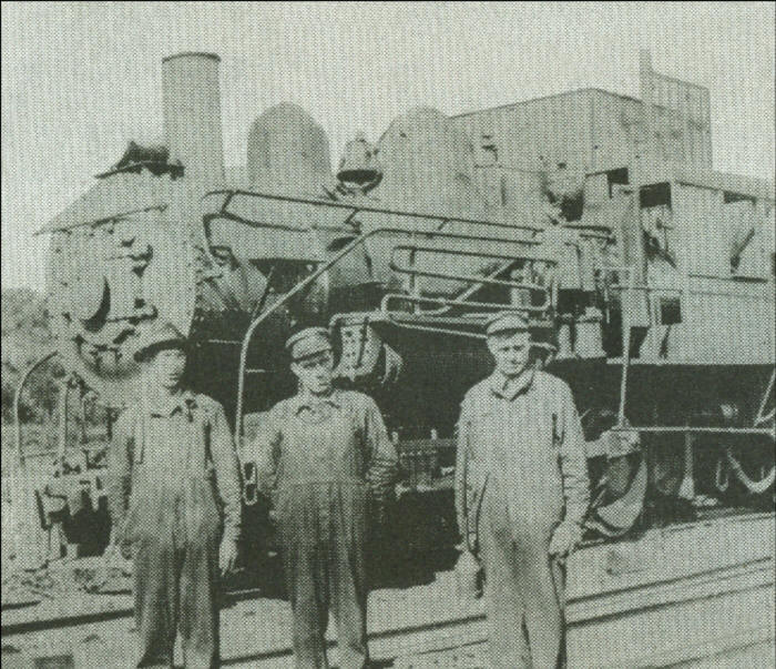 A train crew standing near the locomotive which ran the railroad line going through Willard in the early 1900s.