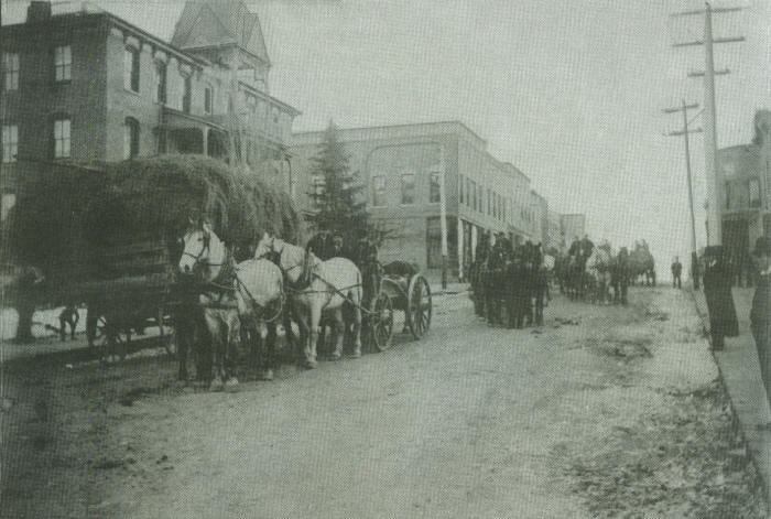 Teamsters, teams and wagons halted long enough to be photographed on the busy Main Street of Neillsville on a late 1800s day. A load of hay being hauled to a livery stable stopped in front of the O’Neill House, as a line-up of wagons were traveling northward. The O’Neill House was an elegant hotel, later destroyed by fire. The Neillsville post office now occupies the lot. (Photo courtesy of the Clark County Jail Museum)