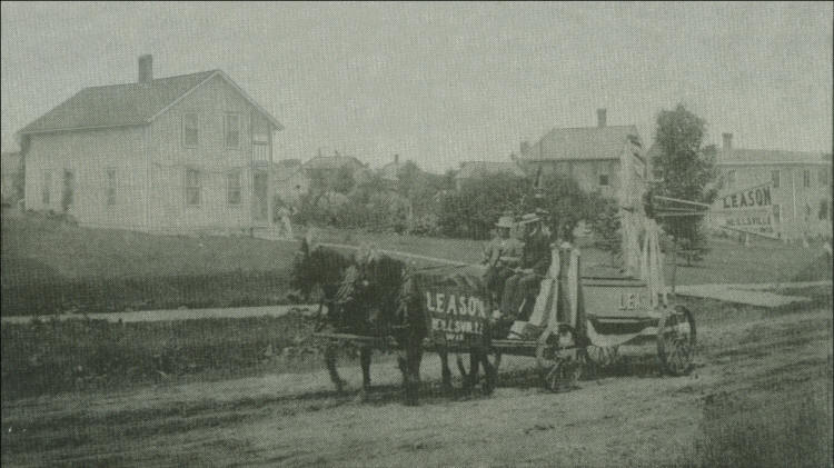 The Leason Windmill Company participated in a parade along Grand Avenue in Neillsville, circa 1880-1890. The wagon being pulled by the team of horses may have been the one which was put on the Fifth Street livery barn’s roof by some Halloween pranksters in 1893. In the background, at the far right is the Tragsdorf home, and in the middle is the Lowe house. (Photo is courtesy of the Clark County Jail Museum)