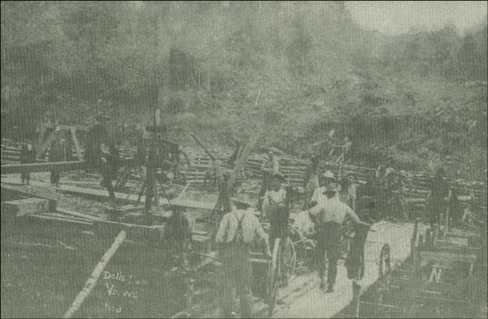 Scaffoldings made of lumber and logs set the forms for the Dell’s Dam base, setup in 1911