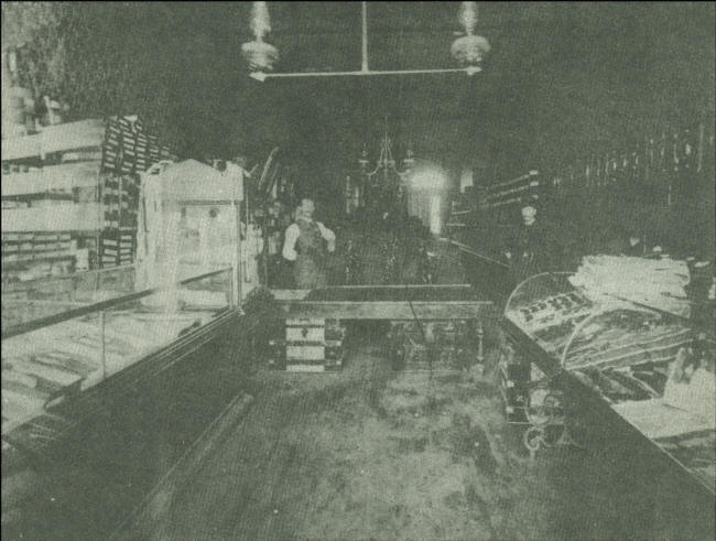 Located on Hewett Street, Neillsville, in the late 1800s. Johnson sold his store and merchandise to August Snyder in 1903: Light fixtures were kerosene lamps held in ceiling brackets. Two traveling trunks held up the large table serving as a service counter. (Photo courtesy of Clark County Historical Society Jail Museum)