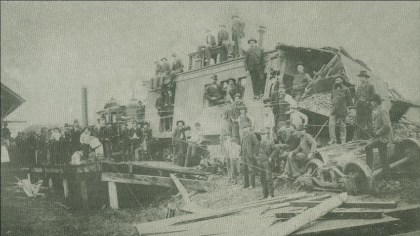A Train Wreck in the City of Greenwood, date unknown. The train line was owned by F. N. Foster