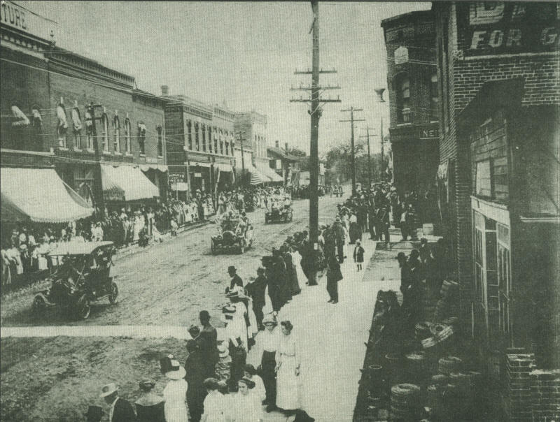 A parade, circa 1910, drew a large crowd of spectators on a summer day along Hewett Street in Neillsville. Notice the main entrance to the Neillsville Bank: was located on the corner of the building, Sixth Street and Hewett Street corner. (Photo courtesy of Clark County Historical Jail Museum)