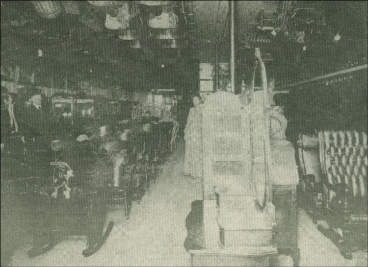H. H. Eberhardts Store was located on Hewett Street, starting in 1892. Mrs. Eberhardt worked with her husband in the store. Wooden racks were anchored to the ceiling which held various chairs on display in addition to those on the main floor. (Photo courtesy of L. Schoengarth)