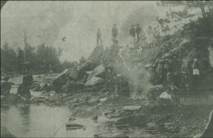A summer time outing shared by several people of all ages, joined in fishing near Dells Dam on the Black River, circa 1910. (Photo from the Schultz family collection who lived near Dells Dam)