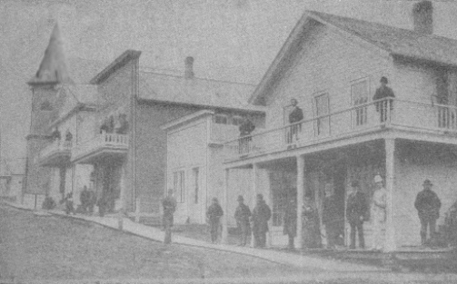 Across Sixth Street, in the 500 block and on the corner, was a wooden building occupied by the Corner Saloon. The business was first managed by Hank Mayers, and later, Ira McIntyre owned the business for a few years. About 1870, James O’Neill established a grocery store in the building, running the business for four years. In 1874, the business was sold to F. Kountz, who operated it for two years, then sold out to Hewett & Woods.