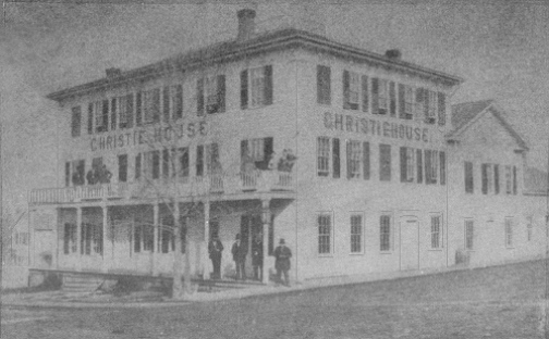 The Christie House as it appeared in 1860. Built by James O'Neill, the hotel carried the name "O'Neill House" during most of its existence. The hotel's wood exterior was later brick veneered. Destroyed by fire in 1912, it wasn't rebuilt. The Neillsville Post Office is now (2004) on the Sixth and Hewett Street corner lot. |
