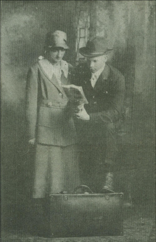 This young couple seems to be checking their travel brochure in readiness for a journey. The style of clothing dates back to the “Flapper Era” of 1920s.