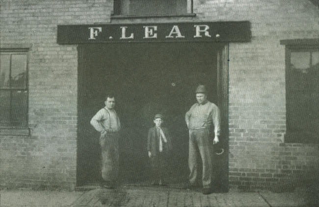 Fred Lear, far right, holding a horseshoe in his hand, owned and operated a blacksmith shop on Grand Avenue in the early 1900s. The shop was located in the middle of the 500 block, east side, now site of a parking lot north of First Financial. Fel-Gross Chevrolet started using the building for their business in the late ’56. The old building was razed about ten years ago.