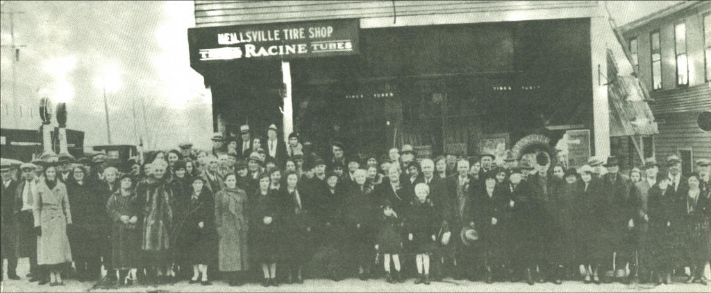 The Howards anniversary party was held at the I.O.O.F. Hall at 140 West Fifth Street (now Dave’s Auto Parts Store). Everyone gathered for a photo which was taken across the West Street intersection, at 204 West Fifth St., in front of the Neillsville Tire Shop. (The two story building was later torn down and replaced by a one story structure). Mr. and Mrs. John Howard are standing in the center of the first row with two children (Marguerite Brown Tibbetts and Jan Brown Tibbetts), and surrounded by relatives and guests. (Photo courtesy of Marguerite Tibbetts)
