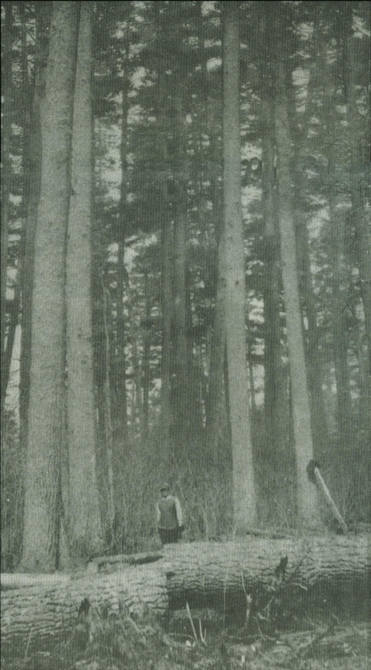 Wisconsin’s virgin white pine grew tall, blocking out the sun’s rays. The man standing near the trees depicts the enormity of the pine growth. The scene was captured circa 1910 in Sawyer or Washburn County, the last area to be cleared of its virgin timber in Wisconsin. Western Clark County had similar stands of timber, losing their virgin white pine in 1860 to 1880’s. (Photo courtesy of George H. Crothers whose mother obtained the photo while teaching school in Drummond, Wis., circa 1910-1920)