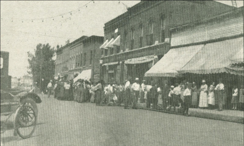 A circa 1910 Hewett Street scene with a gathering of people participating in a sidewalk demonstration, in the 500 block, east side of street. (Photo courtesy of Tuft’s Museum’s Glass Family collection)
