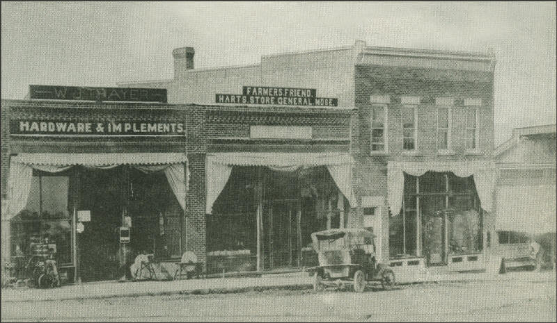 Main Street, Granton, as it appeared circa 1915: The hardware and implement store was owned by W. J. Thayer, who advertised some items with a sidewalk display. Hart’s General Merchant’s Store, next door had “tin Lizzie” car parked near the front door entrance. (Photo courtesy of the Webster Family Collection)