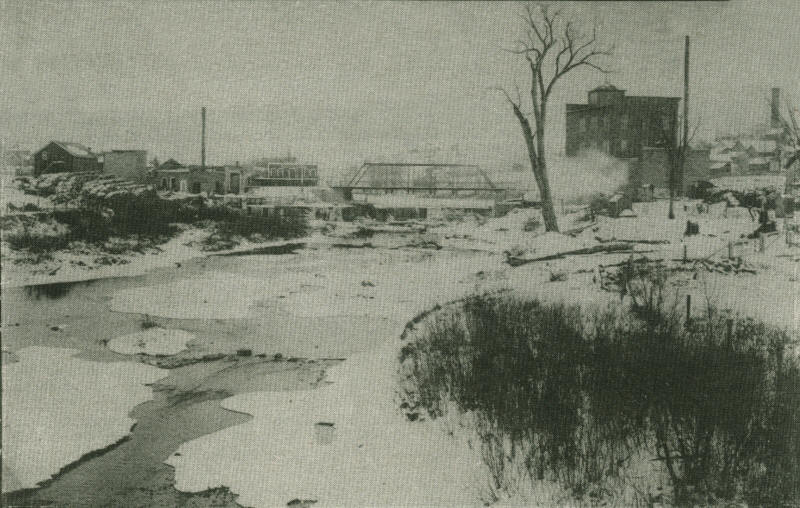 A quiet day in Neillsville, looking over O’Neill Creek, circa 1900; A small cloud of smoke hangs over the creek and Hewett Street Bridge as the partially frozen stream moves toward the Black River. The Neillsville Milling building is visible in the background, to the right. Rows of corded wood ascend the creek’s shoreline on the left. (Photo courtesy of Loomis-Seffern Family Collection)