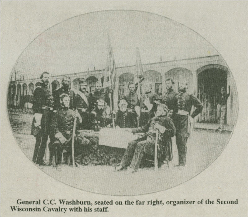 General C. C. Washburn seated on the far right, organizer of the Second Wisconsin Cavalry with his staff.