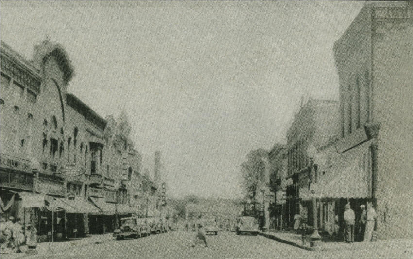 A circa 1940’s view of the 500 block of Hewett Street, Neillsville; The store’s front windows could be shielded from the sun’s rays when the cloth awnings were rolled out on the mounted frames.