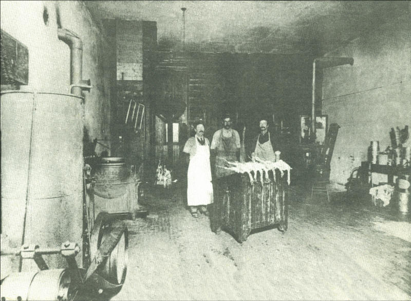 John Wolff’s Central Market was located at 541 Hewett Street, Neillsville, in the late 1800’s. Men in the photo (left to right): John Wolff, wearing the long white apron; Otto Zank, in the middle; the third man is unidentified. The shop was equipped with the standard butcher block, meat saws, and etc. tools of the trade at that time. On that day, it was apparently time to butcher and dress out chickens.