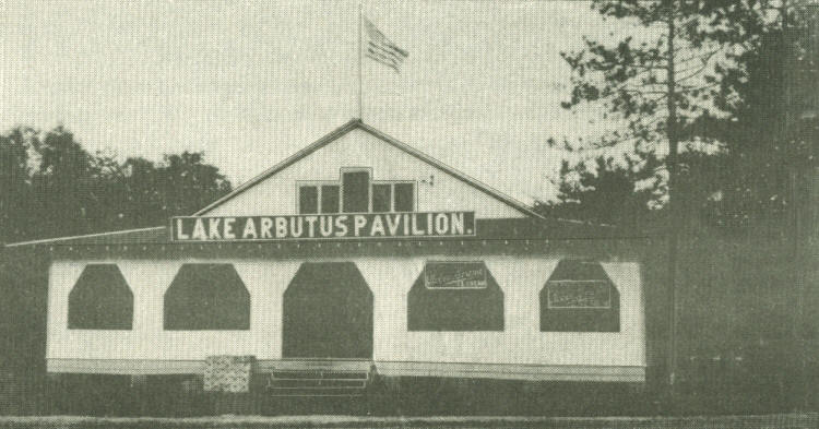 The Lake Arbutus Pavilion as it appeared in its early existence. Built by Joe Hanus in 1921, the first dance was held on the “floating” dance floor on June 22, 1921. A floating dance floor has spring supports, providing the floor with give, or spring action when danced upon. In 1939 Joe and Violet Vieau reused it for roller skating, purchasing it in 1945. The building is still used for roller skating. (Photo courtesy of Ray Strebing Family Collection)