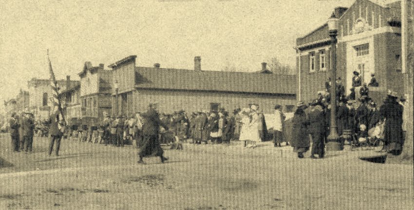 A parade on Neillsville’s Hewett Street, shortly after the new Carnegie Public Library was built and is shown on the far right. At that time, boardwalks were still to be found within the city. (Photo courtesy of the Glass Family Collection)