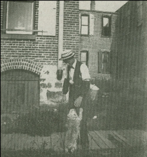 George Sontag, pharmacist of the C. C. Sniteman Drug Store for many years, is shown standing behind the store, circa 1900. The poodle dog, with Sontag, was well known by the area residents as he spent most of his 19 years at the store with Sontag. (Photo courtesy of Sontag Family Collection)