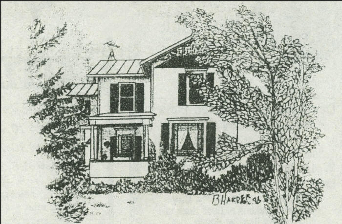 The Claude Sturdevant home was located at 312 W. Fifth Street. Built by Sol F. Jaseph, at a cost of $1500, it was the first home to have electric lights and a lawn in the city of Neillsville. The kitchen wing was added to the home in 1899. Claude Sturdevants grandfathers were James Sturdevant and B. F. French, pioneers of the city, coming in the 1850s. (Drawing by B. Harder)