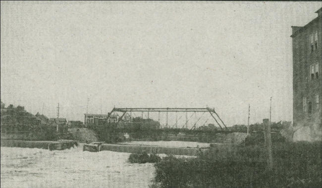 That time, everything was lost that was needed to make the dam. Later, a couple of the heavy steel wheelbarrows were found down near the old furniture factory site. It took nearly a week to replace equipment needed to get started again and to rebuild the wrecked section. Coming to the last 30 feet toward the north bank, the rock ledge took a nosedive straight down and disappeared. The construction plan had suddenly changed to comply with a gravel base. It was then necessary to build a substantial coffer dam too, as a protection from dangerous cave-ins. The water was shunted through two gates, requiring hand-pumps to be kept going night and day to allow work to be carried on in that last trench. Then came flood number four. That time the coffer dam was swept away and not one timber of it was left. Another coffer dam was built and work started again.