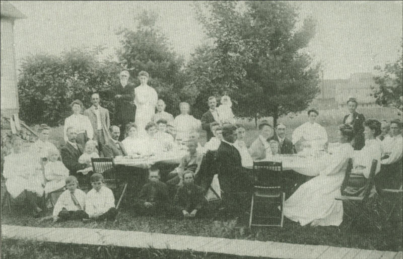 A circa 1905 social gathering was hosted by Mrs. Robert Schofield, standing behind the table on the far tight in the yard of her home. Among her guests were Rev. and Mrs. Hendren, the couple standing in the back, the bearded man holding his hat; Mr. and Mrs. Fred Shrimpton and little daughter seated together by the table on the right; Dr. Hugh Schofield, standing, center in the back row, holding his daughter, Roberta. Among the other guests were: Geo. and Rose Van Vooris, H. Hartson, Allie Schofield, Ingalor Hogine and Delia. Robert Schofield, a prominent and successful pioneer of Clark County, left, as a part of his legacy, an attractive Victorian-era home located at 303 W. Schofield Ave. in Greenwood where he resided. The unique Schofield house has met the criteria to be accepted onto the National Register of Historic Places, a credit to the community and city of Greenwood. The present owners, Dave and Sue Roth are in the process of restoring this historical gem.