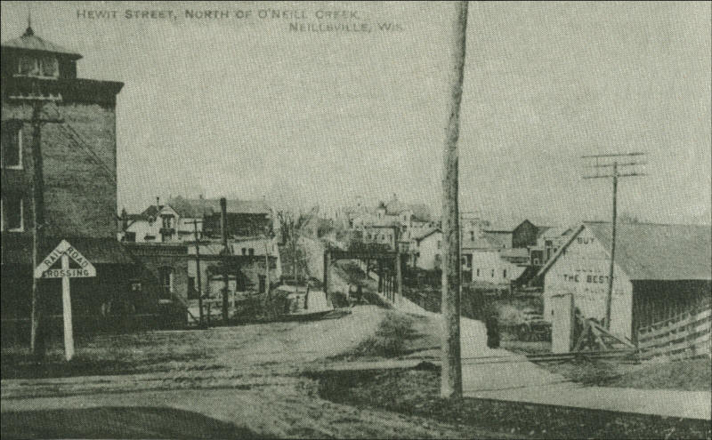 A circa 1900 view of Hewett Street, as a dirt road, crossing the O’Neill Creek on its route through Neillsville’s north side, now also Highway 73. The Neillsville Milling Co.’s buildings are show in the foreground. (Photo courtesy of the Webster Family Collection)