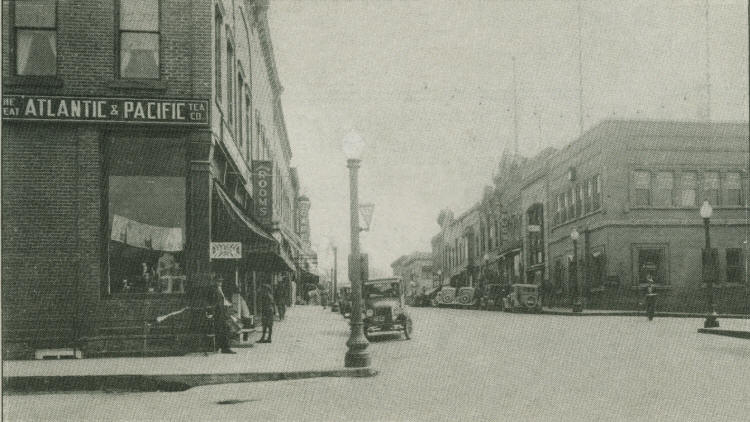 An early 1930’s view of the Hewett Street 500 block, from the Sixth Street intersection, looking south. Customers were out and about, busy shopping in the downtown stores. The barber shop sign on the A & P store drew attention to the barber shop in the basement of that building.