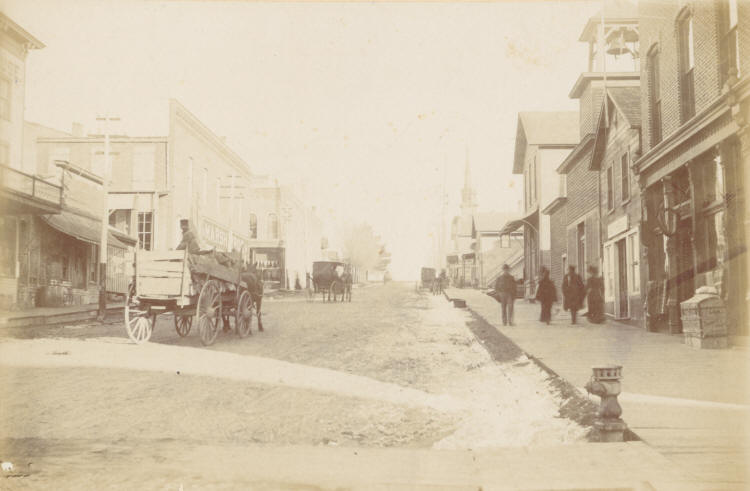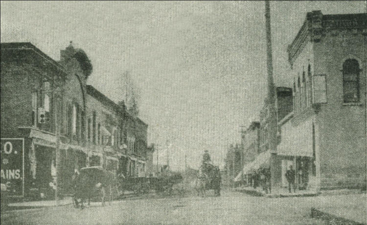 A view of the Fifth and Hewett intersection, looking north, circa 1900, the days of the buggies and wagons pulled by live horse-power.