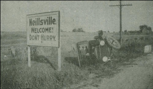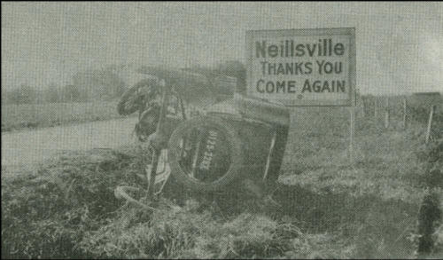 This car accident was photographed along Highway 10, now County Road B one mile west of Neillsville in the early 1920s. The Ford coupe tipped over in the ditch after leaving the roadway. A barn show in the distance, far right, also served as a billboard and read, “It pays to Buy at Sniteman Druggists.” The roadside Neillsville Welcome sign also ironically states, “Don’t Hurry.” (Photos courtesy of Bud and Opal Hanke)