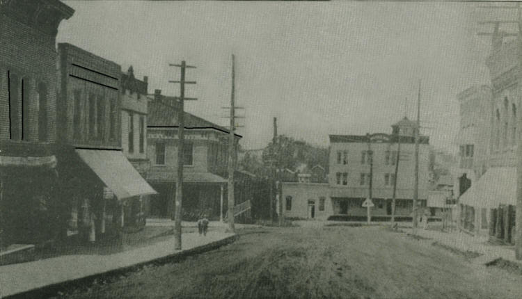 A circa 1900 view of the Hewett Street and Seventh Street intersection shows the front of Dangers Store on the southwest corner and the Merchants Hotel on the northwest corner of Seventh Street. At the center and background is the Neillsville Mills building.