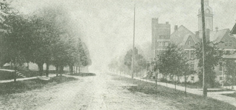 East Fifth Street, Neillsville, near the State Street intersection in the days of boardwalks and dirt or mud streets. The Clark County courthouse dome and jail are visible in the background.