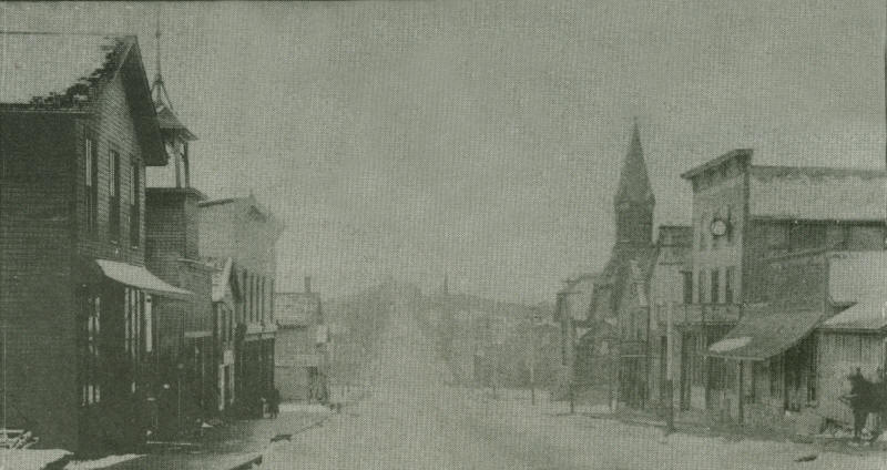 This is West Fifth Street from the Hewett Street intersection, Neillsville, in late 1800s. The second building on the left, with the bell tower, is the city hall and the fourth building be recognized as the I.O.O.F. building. The steeple on the right side is that of the Congregational Church. This was also the era of the boardwalks. (Photo courtesy of the Bill Roberts Collection)
