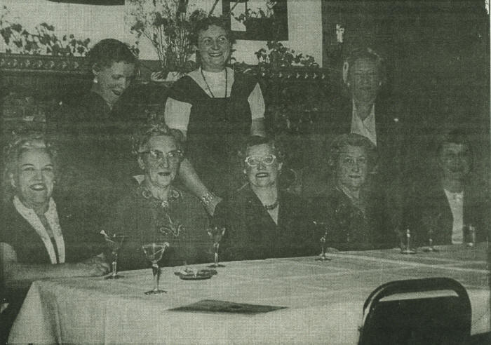 A bridge club Christmas party, held in 1952, at Kellers Supper Club along Highway 10, west of Neillsville. Left to right, standing in the back row by the fireplace were; Evelyn Schwantes, Marie Covell and Harriet Peterson. Front row: Esther Parry, Beth Munger, Lorena Rude, Alta Allen and Edna Russell. (Photo courtesy of the Covell Family Photo Collection)