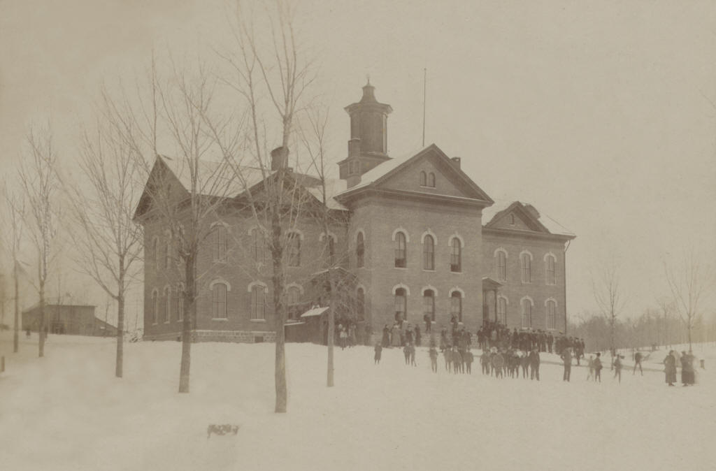 A wintry day with children enjoying, the snow-covered playground of the Neillsville Graded School yard along the State and Fourth Streets corner in the 1870’s. The young people could have been playing games such as “Fox, Fox, Goose,” a fun game played by making paths in the snow.