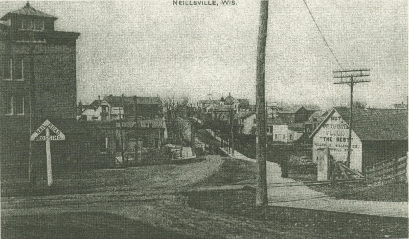 Circa 1900 view of North Hewett Street, railroad tracks in the foreground. To the right, the lettering on the building says, Buy Todays Flour, The Best, Neillsville Milling Co., Wm. Hemphill, Prop. (Photo courtesy of Bill Roberts Collection)