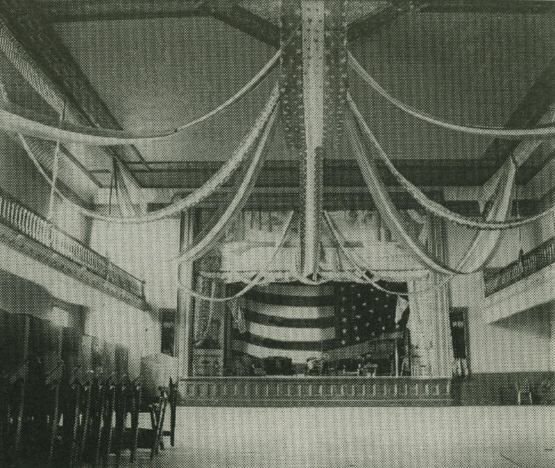 Many times throughout its history, the Neillsville Armory, that was located in the 100 block of East Fourth Street, took on the patriotic theme in dιcor. The auditorium served various organizations in addition to the Neillsville School and National Guard unit for their functions.
