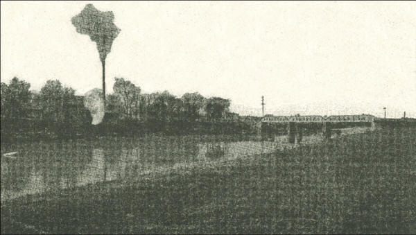 The Grand Avenue bridge, at the right and the Neillsville City Water works, with its smoke stack, on the south side of the Black River, circa 1930. The photo was taken along the north bank of the river, east of the bridge. (Photo courtesy of Bill Roberts)