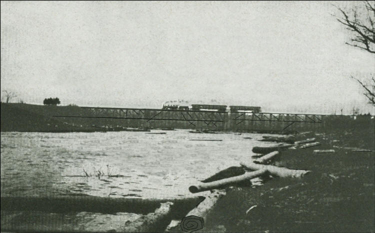 An early scene of a railroad engine pulling flat cars loaded with logs on a train track trestle that spanned the Black River. Logs along the shoreline were remnants of past log-drives that were commonly the means of transporting logs to the markets downstream. (Photo courtesy of the Sontag Family Collection)