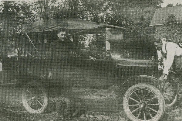 The early automobiles came in a limited choice of styles and colors. The only available colors, in circa 1910, were black or dark blue. The means of starting the cars in the photo was by cranking the motor such as the man at the right is doing. (Photo courtesy of Raymond Zipfel)