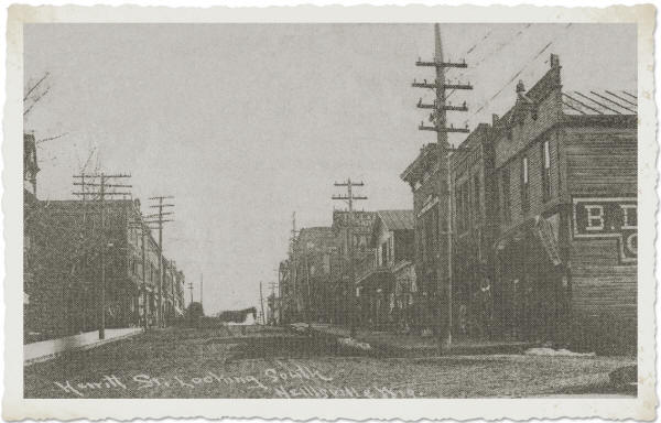 An early Hewett Street, Neillsville scene near the Seventh Street intersection looking south. It was during the days of boardwalks, utility poles along the walks and horse-and-buggy transportation.