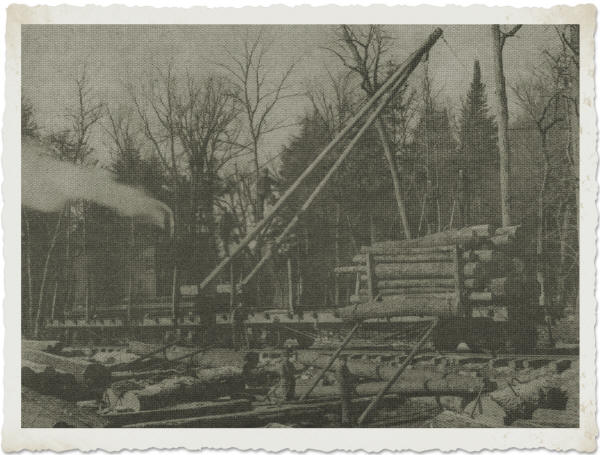 Methods used in transporting logs from the woods in the early 1900s had changed, in comparison to the earlier years. Loading logs on railroad flat cars enabled hauling logs any time of the year, rather than only during the winter months when there was snow and ice for sledding the logs out to market. (Photo courtesy of Dick and Joanne Tibbett)