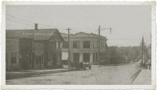 A view of downtown Neillsville’s Fifth Street businesses in 1917, (left to right): Woeller’s Drug Store (on bench in front); D. Matheson’s Store; Shoe Shop; W. F. Woodward Real Estate & Rentals w/Auction Sales & Collecting Attended to; at the Corner of Fifth & Hewett Streets, First National Bank; Ratch’s Barber Shop in Bank’s basement; Harness Shop; Lauson Engines, w/Gale Farm Tools, DeLaval Separators, at the southwest corner of 5th & West Streets. (Photo courtesy of Bill Roberts’ Family Collection)