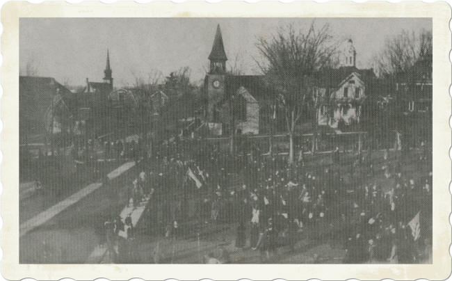 Participants in an early 1900s patriotic celebration assembled on the southeast corner of Court and Fourth streets, Neillsville, possibly in preparation for a parade, or dedication. Visible in the background of the photo left to right, are the Presbyterian Church steeple, the Methodist Church and the Court House. (Photo courtesy of Patricia Walls family collection)