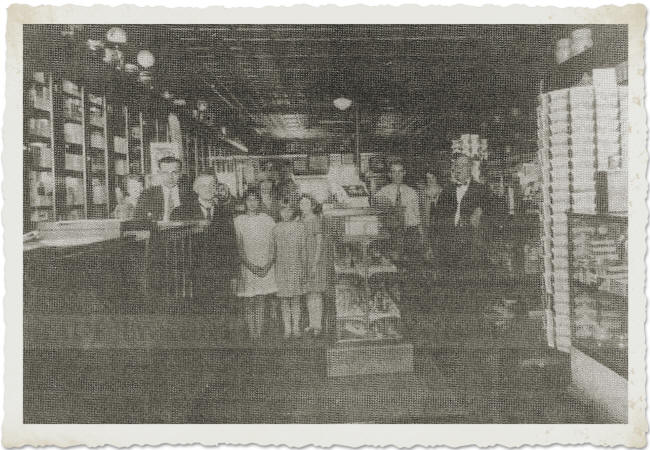 This interior view of C. C. Sniteman Pharmacy was taken circa 1920. Built in 1895, the uniqueness of the building process was that of constructing the new facility around the old drug store building, with business as usual during that time. After the new 2-story structure was up, the old building was dismantled, piece-by-piece, and removed from the premises. The gentlemen in the photo, at the left: Dave Perry and C. C. Sniteman with George Sontag, on the far right. Perry and Sontag worked as pharmacists with Sniteman. (Photo courtesy of Bill Roberts Collection)