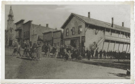 The National Guards marched in a patriotic parade along Hewett Street through the 5th street intersection with the Hemp’s Grocery Store in the background. (Photo courtesy of Bill Roberts’ Collection)